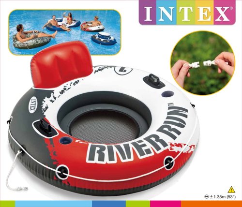 Je sedátko do vody s držadly, držáky na pití a opěrkou na záda. V robustním nafukovacím křesle River Run s průměrem 135 cm se nemusíte bát o nedostatek pohodlí. Mřížkovaná vsadka na podlaze pro zchlazení, integrované opěradlo, 2 držáky na nápoje, 2 vzduchové komory a vinyl o tloušťce 0,45 mm nabízejí spoustu luxusu a příjemně strávených hodin. Vyrobeno z kvalitního vinylu. Nafukovací hračky a potřeby Intex splňují nejpřísnější bezpečnostní normy na zpracování a použité materiály.