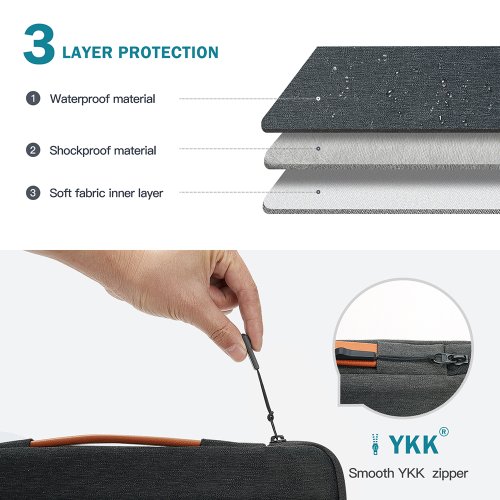 Taška je vyrobena ze tří vrstev textilie - vnější voděodolný materiál, který odolá cákancům vody, střední nárazu vzdorný materiál a vnitřní měkký materiál. Díky těmto třem textiliím máte jistotu, že je vaše zařízení v bezpečí za všech okolností. Rohy brašny jsou navíc opatřeny ochranou rohů zařízení.