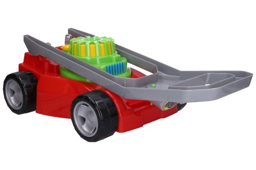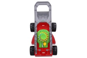 Sekačka na trávu. Složená sekačka 68(d) x 28(š) x 55(v) cm, včetně rukojeti. Přední kolečka jsou volná, zadní kolečka při jízdě cvakají. Sekačka bez rukojeti 37x28x19 cm. V rukojeti je cvakající otočný spínač. Uprostřed sekačky je barevná rotující spirála, která se roztáčí vytažením, nebo zasunutím páčky.