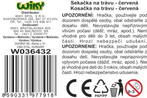 Sekačka na trávu. Červená barva. Rozměry 28x60x50 cm.