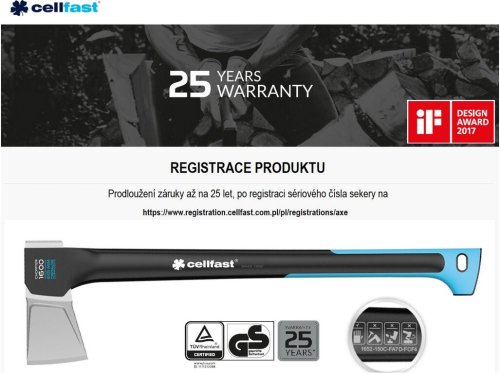 Štípací sekera je vhodná pro přípravu menšího palivového dřeva, na štípání menších kmenů do průměru 20 cm a na sekání dřeva na podpal. Lze ji používat jednou rukou, je lehká. Rukojeť je z kompozitu vyztuženého skelnými vlákny, povrch je měkký, neklouzavý, poskytuje pohodlí při používání a odpružení při nárazu. Sekera má kryt zaručující bezpečnou manipulaci a skladování. Délka: 450 mm, hmotnost: 1,2 kg. Záruka: 25 let po registraci na web.stránce. Sekera má certifikát TÜV GS.