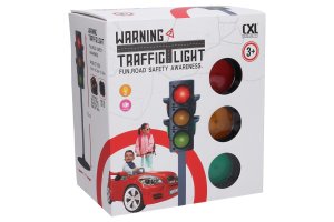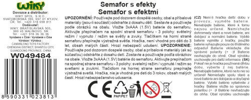 Semafor se světelnými a zvukovými efekty. Rozměry s podstavcem 71x25x25 cm, bez podstavce 19x12x12 cm. Přepínač na spodní straně - střední poloha - vypnuto, doleva - světelný režim, doprava - režim se světly a zvukem. Tlačítkem na horní straně semaforu je možné přepínat výstražná světla. Krytka na baterie na spodní straně - 3xAAA baterie (1,5V) nejsou součástí balení. Návod na sestavení na obalu.