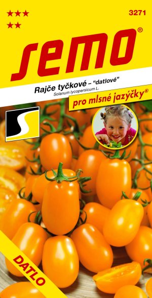 Rajče z kolekce "Pro mlsné jazýčky", plody datlového tvaru zrají do sytě žluté barvy, mají hmotnost 16 – 20 g, jsou atraktivní na vzhled a velice chutné.