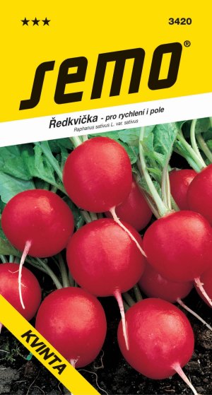 KVINTA - „celoroční“ raná až poloraná odrůda ředkvičky pro rané polní pěstování i pro podzimní výsevy od 15. srpna. Větší kulatá bulvička se svítivě červenou barvou a jemnou slupkou ji činí velmi atraktivní. Dužnina je bílá, jemná, velmi odolná k houbovatění. List je polovzpřímený, mohutnější, světle zelené barvy. Je velmi odolná k praskání a vybíhání do květu. Pro podzimní setí doporučujeme řádky 10 – 12 cm, 300 – 350 semen/m2 .