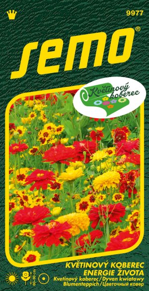 ENERGIE ŽIVOTA (kód 9977) - kolekce KVĚTINOVÝ KOBEREC - směs složená ze 7 letniček, které nám svojí sytou a jasnou barvou představují rozkvetlou energii okamžiku. Květy v podání žlutých a červených tónů cínie, aksamitníku, krásnoočka a titónie nás nenechají v klidu. Letničky vyséváme od dubna do června, doba květu je červenec až září, vždy v závislosti na výsevu. Výška květinového koberce je 60-90 cm.