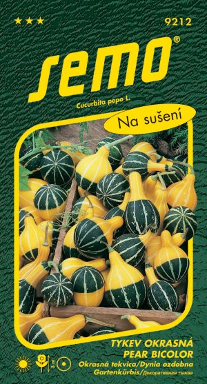 Dvoubarevné žlutozelené plody ve tvaru drobných hruštiček. Lehce se vysuší, nehnijí a tvoří dlouhodobou dekoraci. Jednoletá poléhavá rostlina s dlouhými výhony. Pěstujeme jako jiné tykve, můžeme ji nechat popínat po pergole nebo jiné konstrukci. Přináší množství drobných plodů ve směsi barev a tvarů. Upřednostňuje slunnou lokalitu a teplé záhřevné půdy.