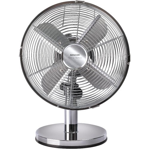 Kovový stolní ventilátor Průměr lopatek 25 cm Vysoce kvalitní pochromované provedení Přední a zadní kovová ochranná mřížka 3 rychlosti Automatická horizontální rotace v úhlu 90° s možností vypnutí Nastavitelný úhel sklonu Ochrana proti přehřátí Otočný spínač na krytu motoru Pogumovaná spodní část ventilátoru zajišťující vysokou stabilitu Příkon: 30 W