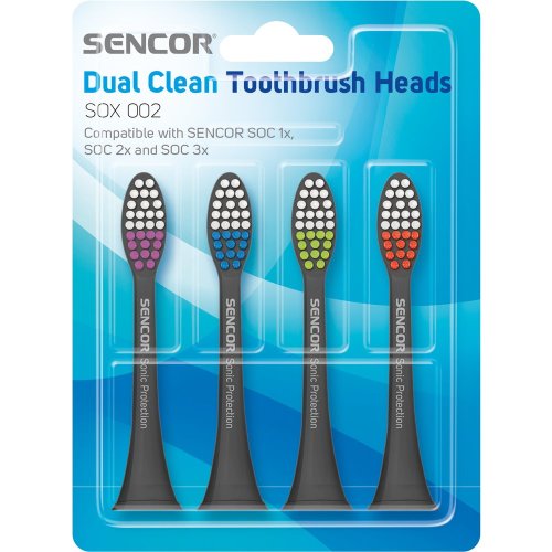 Náhradní hlavice k sonickému zubnímu kartáčku díky tvaru zaručují vyčištění i běžně velmi těžko dosažitelných prostor mezi zuby. Jednotlivé hlavice mají různou barvu štětin pro jednoduchou identifikaci. Tvar štětin a sonická technologie kartáčku Sencor zbavují zuby zubního plaku mnohem efektivněji než při čistěním manuálním kartáčkem. Každý jednotlivý zub je při správním čištění setřen více než 2 500 krát. Hlavice jsou uzpůsobeny pro každodenní používání díky jemným vláknům, které podporují regeneraci dásní a pomáhají s prevencí zubních onemocnění. Jsou kompatibilní se všemi kartáčky Sencor Sonic Protection SOC 1x, 2x i 3x.