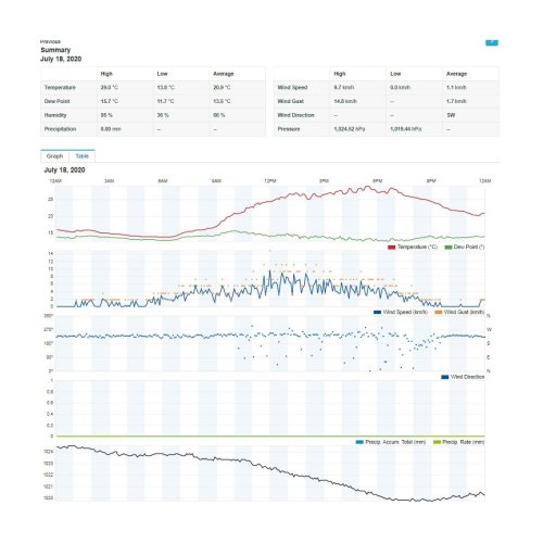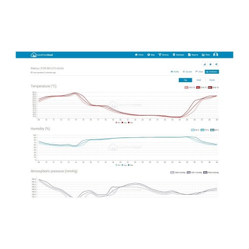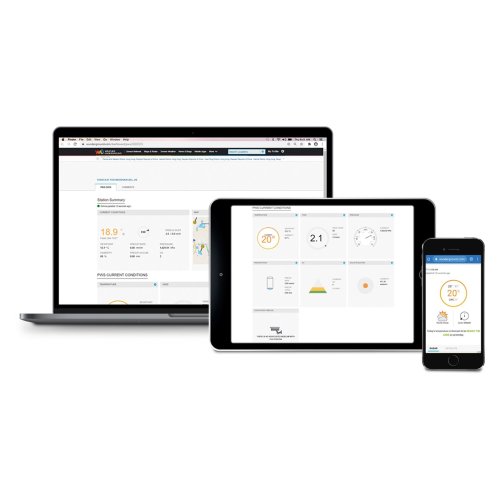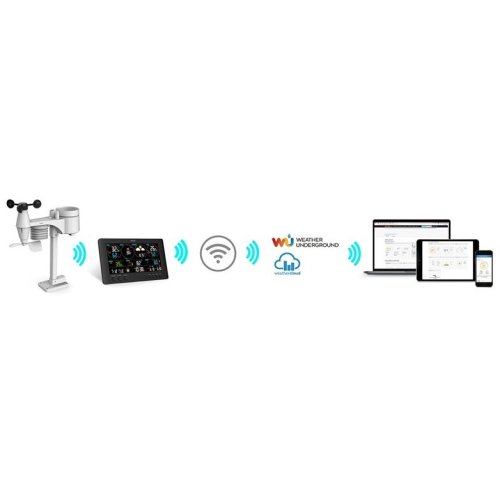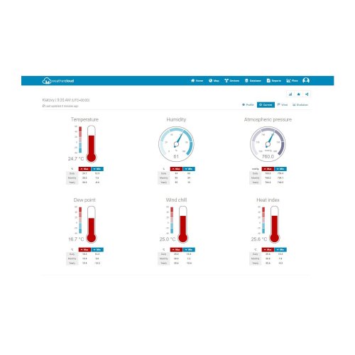 Podpora globálních veřejných meteorologických platforem „Weather Underground" a „Weathercloud" Publikování údajů o místní meteorologické stanici na veřejných meteorologických platformách Podpora chytrých zařízení, online přístup k datům a historii TRUE BLACK Barevný LCD displej s úhlopříčkou 8,4" (21,4 cm) Předpověď na 12 ~ 24 hodin založená na změně tlaku Ikona předpovědi počasí (slunečno, oblačno, zataženo, déšť,bouřka, sněžení) Měření vnitřní teploty a vlhkosti s indikátorem komfortu a vývoje Měření venkovní teploty a vlhkosti s indikátorem vývoje Barometrický tlak v relativních a absolutních hodnotách (hPa, inHg, mmHg) Rozsah měření vnitřní teploty: -5°C až+50°C Rozsah měření venkovní teploty: -40°C až +60°C Rozsah měření vnitřní vlhkosti: 1% až 90% RV Rozsah měření venkovní vlhkosti: 1% až 99% RV Index počasí pro pocitovou teplotu, chlad větru, rosný bod a index teploty UV index (0-16) s UV indikátorem (lehký, střední, vysoký, velmi vysoký, extrémní) Intenzita slunečního světla (Klux, Kfc, W/m2) a doba opálení (minuty) Záznamy max./min. hodnot v paměti s uvedením data a času Hodinový záznam za uplynulých 24 hodin Nastavení výstrahy pro vnitřní/venkovní teplotu a vlhkost (nízká/vysoká) Nastavení výstrahy (meteorologický index, pokles tlaku, vysoká rychlost větru a velké denní srážky) Blikající indikátor výstrahy vysoká/nízká Zobrazení času, kalendáře, dnů v týdnu, měsíční fáze a časů východu / západu slunce Nastavení fáze měsíce pro severní, nebo jižní polokouli Výstraha před náledím a indikace úrovně komfortu Poryv větru nebo průměrná rychlost větru (v mph, m/s, km/h, uzlech) Beaufortova stupnice a indikátor úrovně rychlosti větru Momentální a dominantní směr větru Měření dešťových srážek pomocí hodinového, denního, týdenního, měsíčního a celkového zobrazení úhrnu srážek (mm/inch) Automatické nastavení času a data pomocí WiFi (možnost ručního nastavení) Datum a den v týdnu (den v týdnu v 7 jazycích: EN, DE, FR, ES, IT, NL, RU) Zobrazení stupnice teploty volitelně v °C/°F 3 úrovně jasu displeje: Vysoká/Nízká/Automatické stmívání Solární panel pro automatické nastavení jasu podsvícení Umístění na stůl nebo na stěnu Bezdrátový senzor 7v1: Rychlost větru, směr větru, dešťové srážky, teplota, vlhkost, intenzita světla a UV (součástí příslušenství) TH senzor: SWS TH8600-9898-12500-16600 - teplota, vlhkost (1x senzor v balení) Podpora až 7 bezdrátových senzorů (SWS TH8600-9898-12500-16600 / SWS T POOL PRO) Přenos na dlouhou vzdálenost mezi hlavní jednotkou a senzory 7v1 / TH - až do vzdálenosti 150 m (v otevřeném prostoru) Podpora aktualizace firmwaru Bezdrátový senzor 7v1 - Frekvence hlavní jednotky: 868 MHz Bezdrátový senzor TH - Frekvence hlavní jednotky: 868 MHz Napájecí adaptér hlavní jednotky: DC 5 V / 1000 mA (součást příslušenství), Spotřeba: 5 W Záložní baterie hlavní jednotky: 1 x CR-2032 3 V (součást příslušenství) Baterie pro napájení 7v1 senzoru: 3 x 1,5 V velikosti AA (baterie nejsou součástí balení - doporučujeme Lithiové baterie) Baterie pro napájení TH senzoru: 2 x 1,5 V velikosti AA (baterie nejsou součástí balení - doporučujeme Lithiové baterie) WiFi standard: 802.11 b/g/n, WiFi provozní frekvence: 2,4 GHz Rozměry hlavní jednotky: (š/v/h) 240 x 140 x 21 mm Rozměry bezdrátového snímače 7v1: (š/v/h) 343,5 x 393,5 x 136 mm Rozměry bezdrátového snímače TH: (š/v/h) 58 x 125 x 19 mm Hmotnost hlavní jednotky: 454 g (včetně baterie, bez adaptéru) Hmotnost bezdrátového senzoru 7v1: 673 g (včetně baterií) Hmotnost bezdrátového senzoru TH: 144 g (včetně baterií)