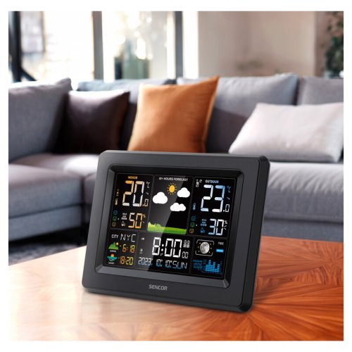 Meteostanice má hodiny s datem (nabízí se 12hodinový a 24hodinový formát času), které jsou řízené rádiovým signálem DCF77. Můžete si nastavit budík s opakovaným buzením a umístit stanici na noční stolek, abyste mohli začít svůj den s předpovědí počasí. Aby vás stanice večer nerušila, je možné ztlumit jas. Jistě vás zaujme také ikona fází měsíce nebo čas východu a západu slunce. Meteostanice SENCOR je pěkným doplňkem každé domácnosti.