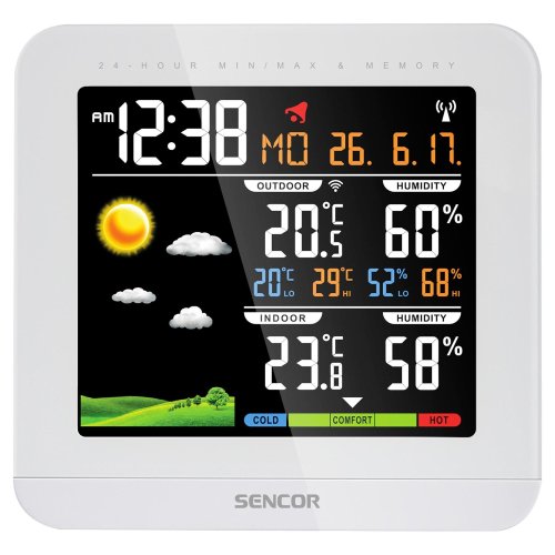 Meteorologická stanice Sencor s bezdrátovým snímačem je ideálním pomocníkem pro sledování počasí jak uvnitř, tak venku. Díky ikonám předpovědi počasí (slunečno, oblačno, déšť, sníh) budete mít vždy přehled o aktuálních podmínkách. Stanice měří vnitřní i venkovní teplotu v rozmezí od -20°C do +50°C a vlhkost od 20% do 99% RV. Ukládá maximální a minimální hodnoty za posledních 24 hodin, takže máte přístup k historickým datům.