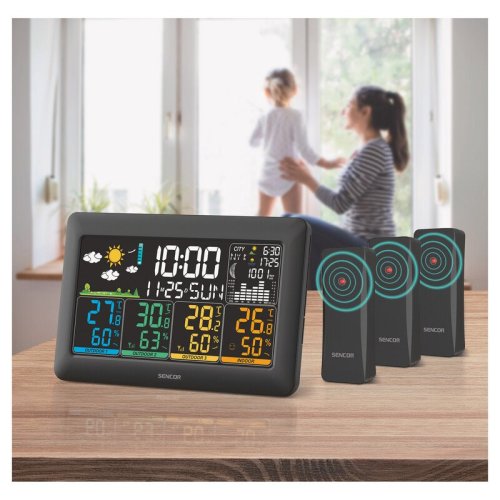 Námrazy, bouřky, letní horka a další rozmary počasí umí změnit plán dne. S meteostanicí SENCOR SWS 6300 vás však nepřekvapí. Umístíte ji na příhodné místo v domácnosti s přístupem k elektrické síti nebo vložte 3 baterie AA. Ven na zahradu nebo na balkon patří venkovní čidla, která jsou napájena bateriemi (2× AA) a fungují bezdrátově. Můžete je umístit až na 80 metrů od meteostanice. Po několika minutách sbírání informací čidla vyšlou aktuální data o venkovním počasí, a ta se zobrazí na barevném displeji včetně předpovědi až na 12–24 hodin. Tři čidla jsou součástí balení.