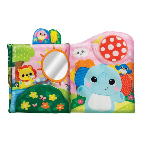 Hudební, zábavná, měkká knížka pro rozvíjení smyslů, s texturovaným kousátkem. Stiskni tlačítko a zazní hudba a zvuky. Obsahuje dětské zrcátko a pískátko. Skvělá zábava na cesty, hračka má tlačítko ON-OFF a Hi-Lo pro nastavení vyšší nebo nižší hlasitosti, vyžaduje baterie 2× AAA, jsou součástí.