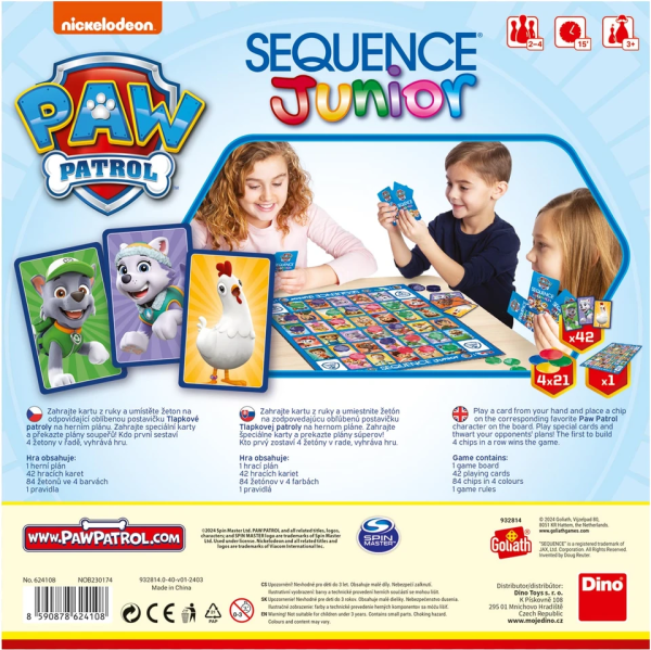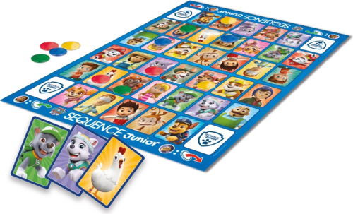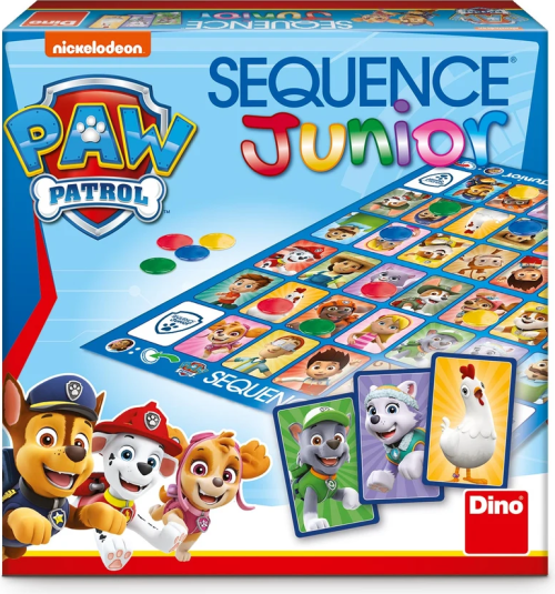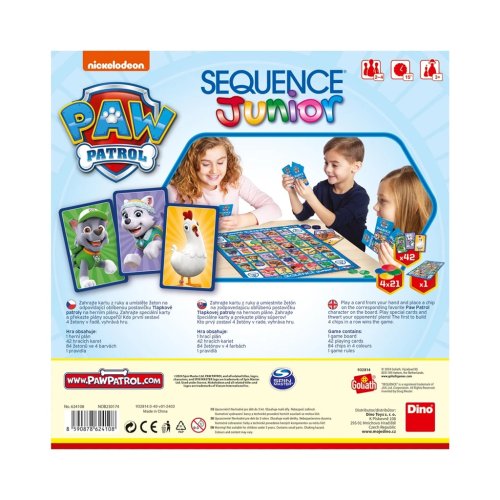 Oblíbená hra Sequence tentokrát pro nejmenší hráče s kamarády z Tlapkové patroly. Zahrajte kartu z ruky a umístěte žeton na odpovídající oblíbenou postavičku Tlapkové patroly na herním plánu. Zahrajte speciální karty a překazte plány soupeřů! Kdo první sestaví 4 žetony v řadě, vyhrává hru. Hra pro 2–4 hráče. Hra obsahuje: 1 herní plán, 42 hracích karet, 84 žetonů, pravidla Rozměr balení: 27 x 27 x 5,5cm Vhodné pro děti od 3 let