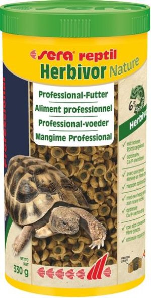 Sera reptil Professional Herbivor Nature je doplňkové krmivo bez barviv a konzervačních látek z plovoucích dvoubarevných granulí vyráběných vysoce funkčním procesem koextruze pro všechny býložravé plazy jako suchozemské želvy a leguáni. Prstenec krmiva obsahuje na vlákninu bohatou směs odpovídající přirozenému nutričnímu spektru a rovněž menší množství potřebných vysoce kvalitních bílkovin a tuků. Jádro krmiva je extrudováno při nižší teplotě a tudíž velmi šetrně a je bohaté na esenciální vitaminy, minerály a řasy pro posílení imunity. Optimální poměr vápníku/fosforu je základem pro zdravý růst kostí a krunýře. Složení: pšeničná mouka, kukuřičný škrob, pšeničný lepek, spirulina (6%), byliny, pivní kvasnice, řepkový olej, kopřivy, vojtěška, petržel, gamarusi, vaječný prášek, mořské řasy, paprika, špenát, karoten, Mannan-oligosacharid, slávka zelenoústá, řasy Haematococcus. Analytické složky: bílkoviny 16,5%, tuky 5,0%, vláknina 12,0%, vlhkost 5,5%, popel 5,9%, Ca 1,8%, P 0,5%. Doplňkové látky: Vitaminy a provitaminy: vit. A 3.700 IU/kg, vit. D3 180 IU/kg, vit. E (D, L-α-tocoferyl acetát) 12 mg/kg, vit. B1 3,5 mg/kg, vit. B2 9 mg/kg, stab. vit. C (L-ascorbyl monofosfát) 55 mg/kg.