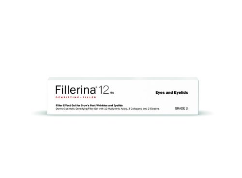 Sérum Fillerina 12HA pro vyplnění hlubokých vrásek na oční okolí je dermokosmetická gelová kúra, která podporuje vyplňování vějířovitých vrásek očních kontur a pomáhá vypínat oční víčka. Obsahuje vysoce modulovanou koncentraci 12 molekul kyseliny hyaluronové, doplněnou 3 molekulami kolagenu a 2 molekulami elastinu s odlišnými molekulovými hmotnostmi, které dodávají tkáním očních kontur a očních víček pevnost a plasticitu. Acetylhexapeptid-30 podporuje protivráskový účinek na oční kontury a na oční víčka tím, že redukuje mikrokontrakce pokožky a tak zlepšuje vzhled mimických vrásek.
