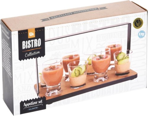 Servírovací podnos + sada 8 ks sklenic- ideální pro přípravu předkrmů, dezertů a pochutin- podnos vyrobený z kovu a dřeva- dva druhy sklenic, celkem 8 skleniček v balení- rozměry: 14 x 24 x 14 cm- značka: Excellent Houseware