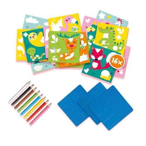 Tato umělecká sada SES obsahuje 16 barevných listů, které lze vybarvit pomocí zábavných plastových destiček s vyvýšenými vzory. Na jednu ze tří destiček položte barevný papír a jemnými tahy přetřete pastelkou. Jaké vzory vidíte? Sada obsahuje: 16 barevných listů, 3 plastové podložky s různou strukturou, 8 barevných pastelek. Rozměr balení: 20 x 20 x 4 cm. Věk: 3+