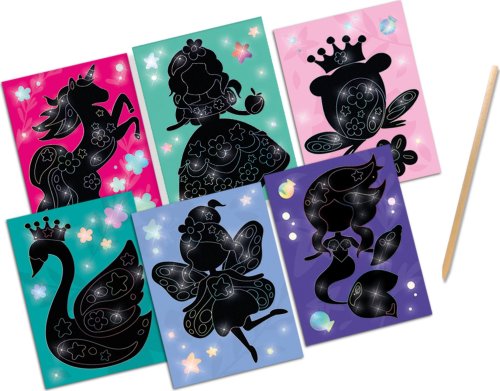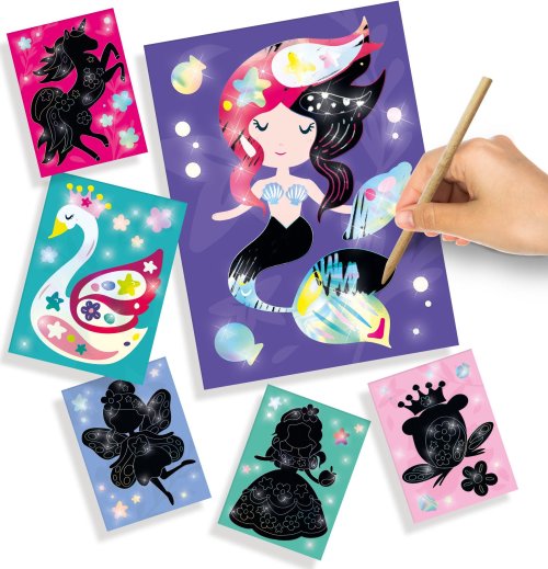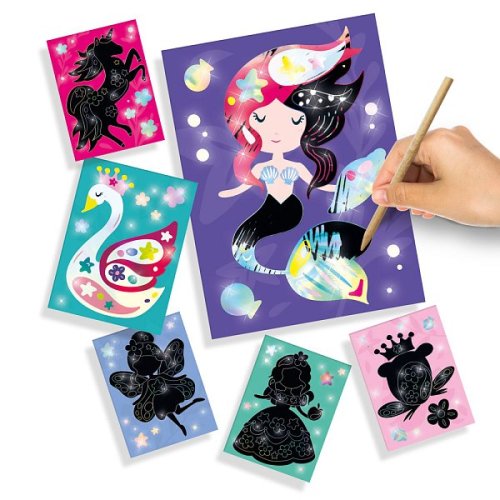 Zábava s barevným koncem! Škrabací obrázky Ses jsou výborným dárkem nejen pro kreativní děti. Papír je potažený černou vrstvou skrývající podklad s holografickým efektem, který z kresby udělá nevšední podívanou. Postup: Pohádkové postavičky ukryté pod tmavou stírací vrstvou mají holografický barevný efekt. Pomocí dřevěného vyškrabávacího pera nakreslete své vlastní krásné vzory a nechte je ještě více zářit! Jednoduše vyškrábejte předkreslené části škrabacím perem a vytvořte obrázek. Fantazii se meze nekladou, proto je možné vyškrábat i černá místa bez potisku a dodat obrázku osobitý rámeček. Obsah balení: 6 holografických vyškrabávacích karet, 1 dřevěné vyškrabávací pero.