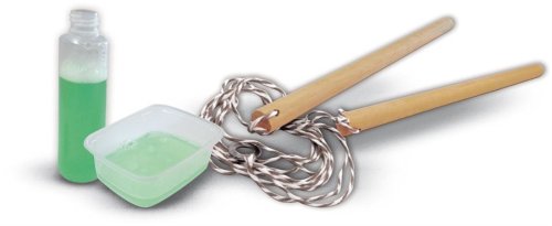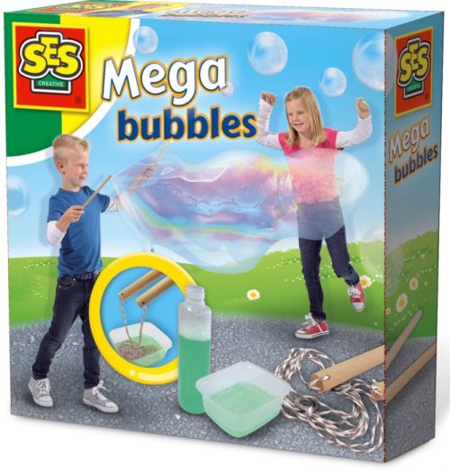 Držte pruty u sebe a ponořte lanko do mýdlového koncentrátu. Vytáhněte a opatrně pruty dejte od sebe. Nyní se Vám vytvořila bublina. Pomalu začněte couvat a sledujte jak se bublina neustále zvětšuje. Až už bude dost veliká, opět dejte pruty k sobě. Megabublina se začne vznášet. Sledujte, jak daleko doletí!