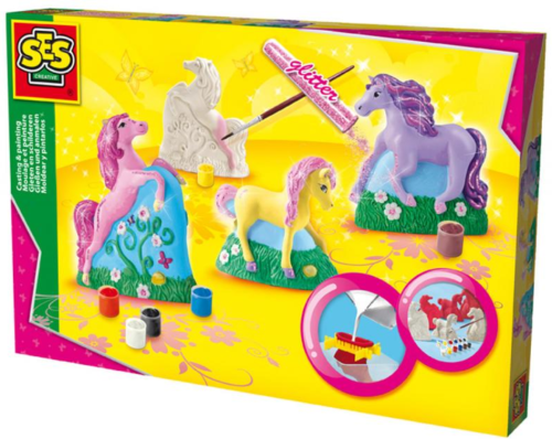 S touto kreativní sadou si můžete vyrábět koníky a krásně si je vymalovat. Nalijte si sádru do různých 3D forem: hříbě, kůň stojící a vzpínající se kůň. Nechte modely zaschnout a potom vybarvěte podle své fantazie. Sada obsahuje: 6 barev, tvořítko na zvířátka, štětec, třpytky. Vhodné pro děti od 5 let.