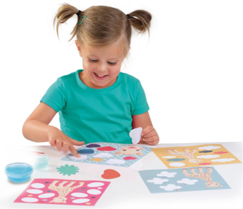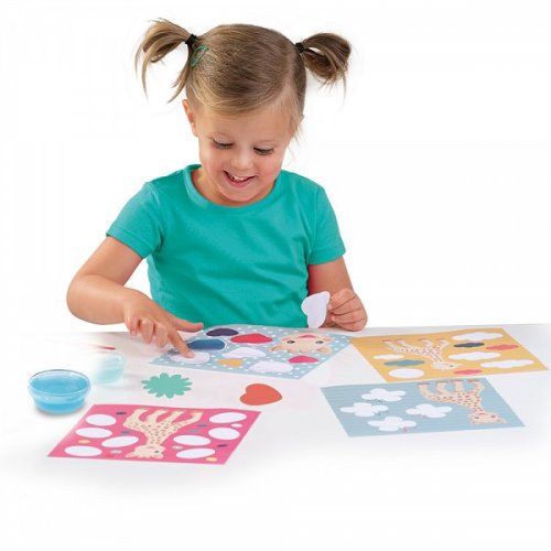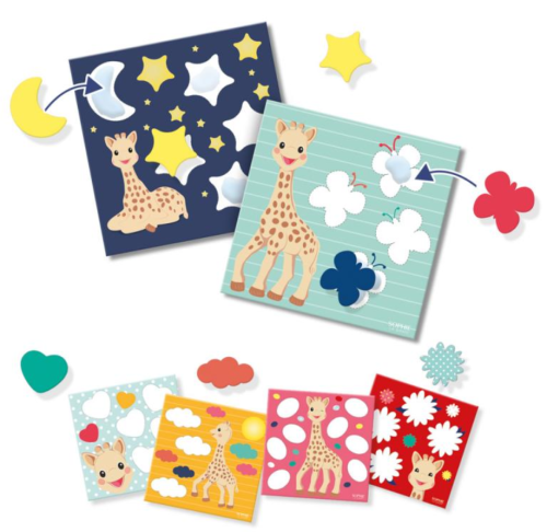 Tato sada SES obsahuje 6 karet s žirafou Sofií, které je třeba vyplnit barevnými tvary. S kouzelným prstovým lepidlem můžete nalepit chybějící tvary na správná místa. Prstové lepidlo má modrou barvu, takže vidíte, kam jste lepidlo nanesli. Jakmile lepidlo zaschne, modrá barva zmizí. Prstové lepidlo je bezpečné a snadno omyvatelné z pokožky a pratelné z většiny textilií. Sada obsahuje: 6 karet s žirafou Sophie, prstové lepidlo, barevné tvary k nalepení. Vhodné pro děti od 1 roku.