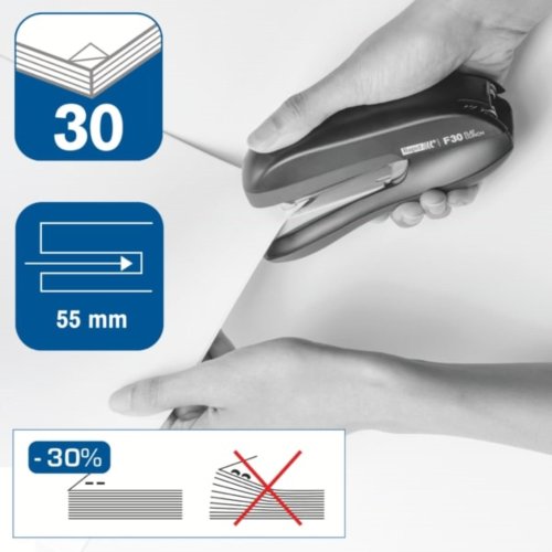 Sešívačka s celokovovou mechanikou potažená ABS plastem a pryží pro snazší sešívání Typy sešívání: ploché, uzavřené; horní plnění drátků Rozměry: 4,6 x 7,9 x 14,8 cm (š x v x h) Hloubka vkládání: 5,5 …