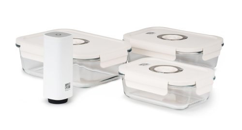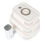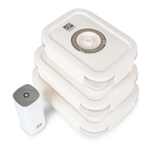 Plastová víka dóz jsou vybavena vakuovacím ventilem a praktickým nastavováním data. Budete tak vědět, kdy byly potraviny vakuovány nebo do kdy se mají spotřebovat. Ventil uprostřed víka lze jemně zmáčknout pro snadné uvolnění vakua.