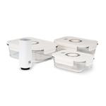 Chcete, aby vaše potraviny zůstaly déle čerstvé, chutné a plné živin? Pořiďte si set G21 vakuovacích dóz s vakuovací pumpou! Tento praktický set obsahuje tři dózy různých objemů a vakuovací pumpu, se kterou snadno a rychle vytvoříte ve svých dózách vakuum. Tak prodloužíte čerstvost a trvanlivost potravin a zachováte jejich vůni, chuť i výživové hodnoty.
