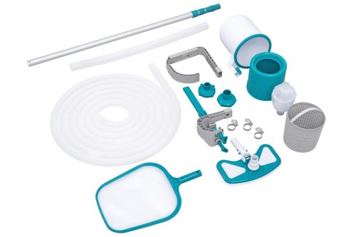 Set obsahuje: povrchový skimmer na listy, který výrazně usnadňuje čištění bazénu. Bazénový vysavač na stěny a podlahu bazénu. Skimmer na manuální odstranění plovoucích nečistot. Nastavitelná násada (279 cm)