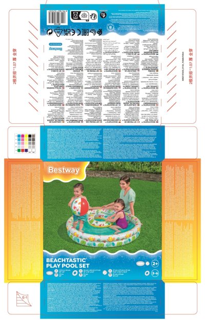 Set nafukovací bazének, kruh a míč Beachtastic™ je navržený s ohledem na malé děti od 2 let, které si chtějí užít bezpečnou a zábavnou letní vodní aktivitu. Bazének má průměr 122 cm a výšku 20 cm, takže nabízí dostatek prostoru pro malé děti k pohodlnému hraní a osvěžení. Je vyroben z odolného PVC materiálu, který zajišťuje dlouhou životnost a bezpečnost při používání. Bazének má dvouvrstvou konstrukci, která zajišťuje stabilitu a pevnost, a jeho stěny jsou zdobené veselými letními motivy, jako jsou plameňáci, ledové nanuky, ovoce a tropické rostliny, což zvyšuje atraktivitu pro děti.