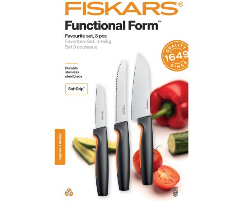 Startovací sada nožů Fiskars Functional Form 1057556 obsahuje nůž okrajovací, snídaňový a malý kuchařský nůž.