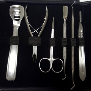 Luxusní 10 nástrojový profesionální set pro pedikérky obsahující kleště (3 ks), exkavátor (2 ks), nůžky, držátko skalpelových čepelek, celokovový hoblík Credo, čepelky č. 21 (10 ks) a čepelky do hoblíku (10 ks). Set je v kvalitním pevném koženkovém balení. Precizní zpracování všech nástrojů zajistí spokojenost při používání.