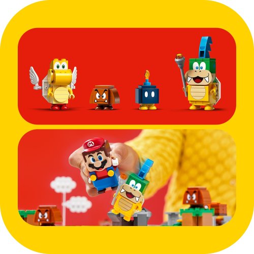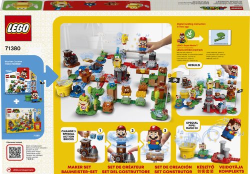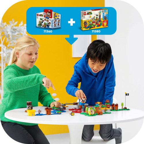 Malí stavitelé mohou se vzrušující stavebnicí Set pro tvůrce – mistrovská dobrodružství (71380) upravovat svůj LEGO® Super Mario™ Startovací set a rozšiřovací sety, a vytvářet tak jedinečné úrovně. Nechybí zvláštní stroj pro výběr odměn, které nabízí časová kostka a 2 kostky se speciálními předměty. Modulární stavebnice zaujme také posuvnou plošinou, barevnými LEGO dílky, které vyvolávají u LEGO® Maria různé reakce (figurka není součástí), a speciální potrubí Dash 30, s jehož pomocí lze přestavovat a vytvářet nové úrovně. Kultovní protivníci Součástí tohoto LEGO Super Mario setu jsou také figurky Larryho, Goomby, Bob-omba a Koopy Paratroopy. Omrkněte také bezplatnou aplikaci LEGO Super Mario s intuitivními nástroji pro prohlížení modelů, spoustou tipů na kreativní stavění a mnohem víc. Zábavné soupeření Sběratelské sety od LEGO Super Mario přenášejí legendární postavu firmy Nintendo® do skutečného světa a hodí se jak pro skupinové zápolení, tak pro hraní v jednom.