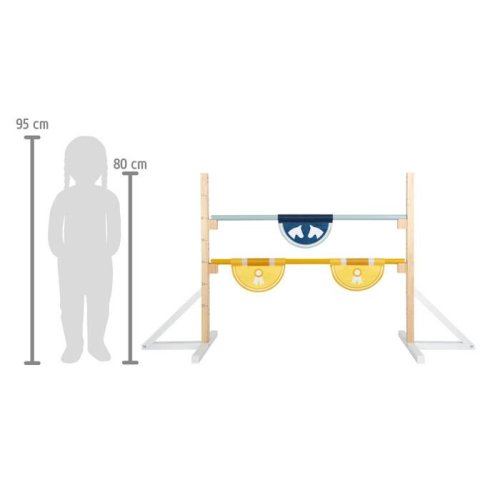 Tato překážka z masivního dřeva přináší spoustu zábavy při skákání pro malé milovníky koní, ať už skáčou sami nebo si hrají se svými koníčky! Překážka, která je postavena stejně jako skutečná, má variabilní výšku mezi 20 a 70 cm. Chcete-li výšku nastavit, jednoduše zasuňte dvě tyče překážky do požadovaných otvorů. Tři malé praporky poskytují autentickou dekoraci příčky. Hra na "koně" a skákání přes překážky s hobby koněm jsou oblíbenou zábavou všech věkových kategorií! A stejně jako u skutečných překážek, tyč při dopadu během skoku spadne! Dva držáky na tyč jsou z obou stran potištěny výškovými mírami a díky základnám z masivního dřeva stojí stabilně. Kombinací s překážkou Kavaleta (LE12397) vytvoříte komplexní cvičební okruh. Kdo dokáže přeskočit tyč, aniž by mu spadla? Hlavní vlastnosti: moderní pastelové provedení s prvky přírodního dřevavhodné pro hru na "koně" (hobby horsing) či psí agilityvýška skoku 20 – 70 cm2 překážkové tyče a 3 dekorativní vlaječkystabilní základna a číselné hodnoty výšky skoku