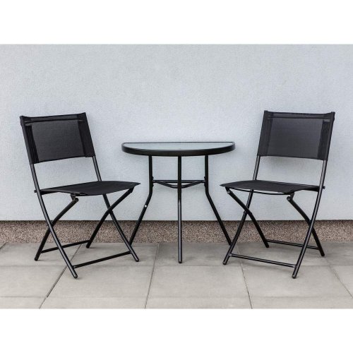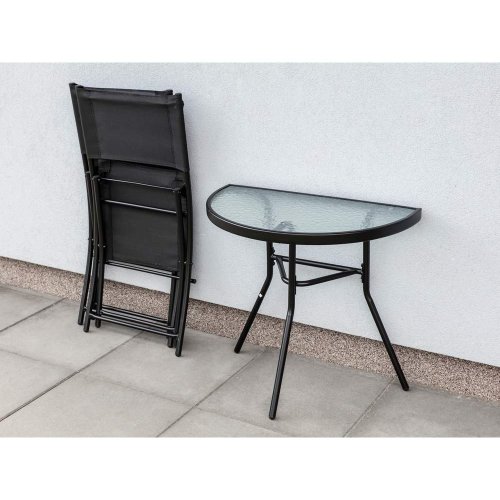 set obsahuje: 1 x půlkruhový stůl s prosklenou vrchní deskou, rozměry 70 x 40 x 63 cm 2 x skládací židle, s textilenovým výpletem 2 x 1, rozměry 55 x 45,5 x 78 cm