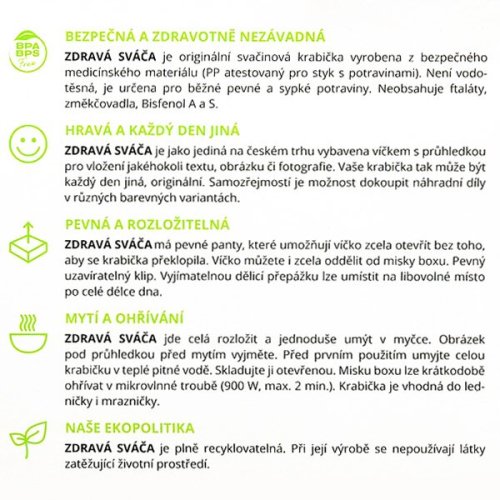 Výhody Zdravé lahve, * neobsahuje ftaláty ani změkčovadla, * zcela nový materiál bez těžkých kovů a Bisfenolu A, * s uzamykatelnou zátkou - těsná i pro sycené nápoje, * nízká hmotnost, * praktické transparentní provedení, * pro nápoje až do 100 °C, * EKOLOGICKY ŠETRNÁ (plně recyklovatelná a při její výrobě nejsou používány látky zatěžující životní prostředí), * vyrobeno v ČR, OBJEM: 0,7 L, VÝŠKA LAHVE VČETNĚ ZÁTKY A PÍTKA: 18,5 CM , , Výhody boxu Zdravá sváča, * originální čirá průhledka pro vložení vašich obrázků či fotografií, * vyjímatelná dělicí přepážka, * neobsahuje ftaláty, změkčovadla, BPA a BPS, * pevné panty, které umožňují víčko zcela otevřít bez toho, aby se krabička překlopila, * vhodný do myčky, ledničky, mrazničky a mikrovlnné trouby, * možnost dokoupení náhradních dílů – barvy můžete kombinovat a vytvořit si tak velké množství barevných variant, * vyrobeno v ČR, ROZMĚRY BOXU: 18 X 13 X 6,5 CM, Údržba Zdravé lahve, * široký otvor pro plnění i čištění, * možno opakovaně mýt v myčce, * lze vyvařit jako kojeneckou láhev (teplota 100 °C po dobu 5 minut), * lze krátkodobě ohřívat v mikrovlné troubě (900 W po dobu 2 minut), * láhev skladujte otevřenou, PŘÍSLUŠENSTVÍ , * Termoobaly - odolný neoprenový termoobal s vynikajícími termoizolačními vlastnostmi. V zimě udrží nápoj teplý, v létě chladný a osvěžující., * Kompletní víčko - ať už z důvodu náhrady opotřebění nebo barevného odlišení., * Zátky - pro případ, kdy ostré dětské zoubky zdeformují zátku natolik, že už nedokáže Zdravou lahev spolehlivě utěsnit, si můžete objednat i pouze samostatnou zátku., * Těsnění - dlouhodobé používání Zdravé lahve může vést k mírnému opotřebení pružného těsnícího "O" kroužku na víčku lahve., * Hubice - pro akční sportovní chvíle., * Krytka na zátku - udržuje pítko v čistotě a zabraňuje úniku nápoje i ve vodorovné poloze., * Šejkr - sítko - adaptér ke Zdravé lahvi, který z ní udělá plnohodnotný šejkr. Nasadí se delším trnem do víčka a po použití se mírným pootočením vyjme., KE STAŽENÍ, PŘÍBALOVÝ LETÁK ZDRAVÁ LAHEV (66 KB), PROHLÁŠENÍ O SHODĚ ZDRAVÁ LAHEV (151 KB), [český výrobek], -------------------------, [Vítěz nezávislého testu MF Dnes] , ZDRAVÁ LAHEV® SE STALA S VÝSLEDNOU ZNÁMKOU 1,1 ZASLOUŽENĚ VÍTĚZEM NEZÁVISLÉHO TESTU MF DNES, A MŮŽE SE TAK PYŠNIT TÍMTO OZNAČENÍM. , PODROBNOSTI O TESTU