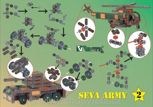 Stavebnice ve vojenských maskovacích barvách pro malé dobrodruhy a bojovnice. Postav letadlo, vrtulník, nákladní vozidlo nebo jinou vojenskou techniku podle svojí fantazie. Pevnost výtvorů můžeš prověřit hrou přímo v přírodě, kde si užiješ spoustu zábavy. Stavebnice SEVA Armáda – letectvo nahrazuje stavebnici SEVA Army 2 a doplňuje novou kolekci SEVA Armáda společně s novými stavebnicemi Bojová vozidla (dříve Army 1) a Speciální jednotka (dříve Army mini 1 a 2). Velkou výhodou stavebnic SEVA je její kompatibilita a možnost neomezené kombinace s ostatními stavebnicemi. Stavebnice obsahuje 511 dílků. Pokud byste si nevěděli rady, součástí balení je také podrobný návod ke skládání.