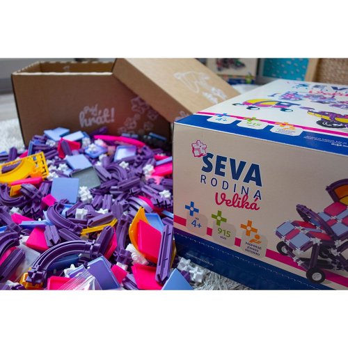 Seva RODINA Veliká - XL velké balení stavebnice od Visty, ze které si můžete sestavit např. dětský kočárek, obývací stěnu a další modely podle vaší fantazie nebo vyobrazení na krabici. Seva je známá a velice originální, česká, polytechnická od českého výrobce Vista. S dostatkem dílků je možné se stavebnicí SEVA postavit v podstatě cokoli. Její koncepce je založena na několika málo různých dílech, které je možné libovolně kombinovat, takže mohou vznikat úžasná a originální díla. Princip stavby je velice jednoduchý nejprve vytvoříte kostru z modrých dílků, které spojíte bílými kostičkami. Dle potřeby pak přidáte žluté či červené čtverce jako stěny u domků či karoserii u aut. Jednoduché věci zvláde postavit i pětileté dítě. Bavit však může tato stavebnice díky své originalitě i dospělé.Balení se může lišit,buď v kvádrové krabici, nebo v šesti-bokém válci. Rozměry balení (š v h): 38 x 27 x 18cm Materiál: plast Počet dílků: 915 Vyrobeno v Česku. Cena je uvedena za 1 balení hračky Hračka je vhodná pro děti od 4 let