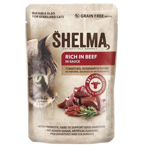 Superprémiové kompletní krmivo pro kočky s hovězím, rajčaty a bylinkami v omáčce.
