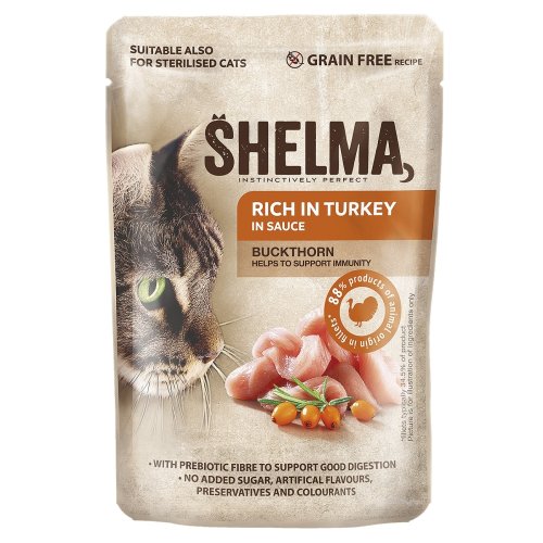 Superprémiové kompletní krmivo pro kočky s krůtou a rakytníkem v omáčce.