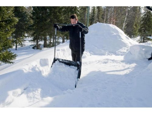 Shrnovač na sníh má držadlo z ocelové trubky, tuhou pozinkovanou ocelovou lištu a bezpečnostní reflexní potisk na držadle. Délka: 1480 mm, šířka: 830 mm, hmotnost: 7000 g. Staré Fiskars číslo: 143040.