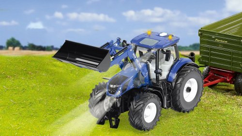 SIKU Control – New Holland T7.315 s předním nakladačem, Bluetooth ovládáním a dálkovým ovladačem (6730). Špičkový RC traktor v modré barvě s výkonem motoru 313 HP, 6 válci a objemem 6,7 litrů. New Holland T7.315 je hvězdou řady Heavy Duty. Výkonný, ale ekonomický motor znamená, že velký traktor je skutečně všestranným pomocníkem na poli i na silnici. Se svým čelním nakladačem se New Holland T7.315 stává preferovanou pracovní jednotkou na farmě. Pomocí aplikace SIKUCONTROL lze ze smartphonu nebo tabletu ovládat 5 rychlostních stupňů, 12 LED diod, četné funkce traktoru a zadní spojku. Pohon zadních kol a řízení jsou proporcionálně ovládány. Ramenem čelního nakladače i samotným nakladačem lze realisticky hýbat. Nakládací rameno může být také vybaveno paletovou vidlicí, čímž se čelní nakladač přemění na vysokozdvižný vozík. Při zvedání je vidlice automaticky udržována vodorovně. Funkce traktoru lze ovládat pomocí virtuálního ovladače gamepadu nebo pomocí pohybových senzorů mobilních zařízení. Tato intuitivní funkce poskytuje ještě větší zábavu při hraní. APP SIKUCONTROL je k dispozici ke stažení zdarma v App Store a Google Play Store. Nastavení a funkce aplikace jsou průběžně aktualizovány. Pomocí funkce aplikace OTA lze také přímo aktualizovat software traktoru. Dálkové ovládání nabízí mnoho možností řízení a ovládání smětlometů. Dálkovým ovladačem 6730 lze ovládat více traktorů SIKU (traktory jsou prodejné samostatně). Měřítko: 1:32. Baterie traktor: 3 x AAA (baterie nejsou součástí balení). Baterie dálkové ovládání: 4 x AA (baterie nejsou součástí balení). Rozměr balení: 37,8 x 17,8 x 15 cm. Věk: 3+. Video: https://www.youtube.com/watch?v=SHSUXtPg4bY