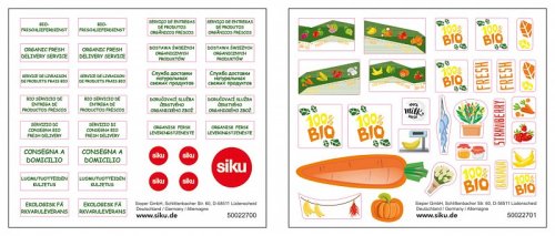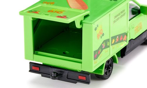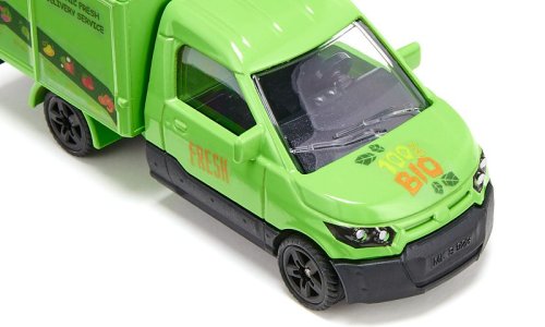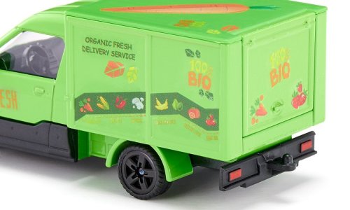 Čerstvá vejce a mléko, křupavý rustikální chléb, šťavnaté ovoce a křupavá zelenina přímo z polí – BIO donášková služba doveze jídlo přímo k vašim domovním dveřím ve městě. Ekologické je nejen zboží, ale i doprava, protože elektrická dodávka StreetScooterem je zcela bez emisí. Kabina řidiče tohoto modelu siku je vyrobena z kovu a nástavba je plastová. Pro nakládání a vykládání lze otevřít víko v zadní části. S přiloženým archem samolepek může být přepravník navíc ozdoben nápisem „Čerstvé bio dodávky“ v různých jazycích a také barevnými obrázky ovoce a zeleniny. A protože zásilková služba vyžaduje vhodné produkty, jsou k dispozici také čtyři kartonové archy, ze kterých lze vylisovat předtištěné potraviny, jako je ovoce, zelenina, vejce a mléko. Pouze na dvou ze čtyř listů jsou však komponenty vytištěny plnobarevně. Na zbylé dva listy jsou vytištěny pouze obrysy, a tak jsou děti samy kreativní a mohou si potraviny barvit, jak chtějí. Rozměry balení: 17,5 x 9,7 x 7,1 cm. Věk: 3+