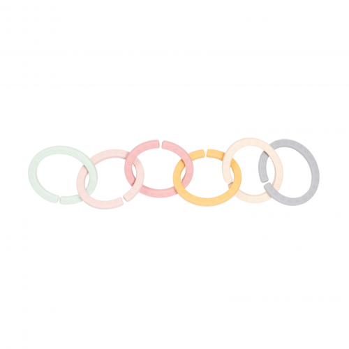 Tyto silikonové kroužky v trendy pastelových barvách lze použít jako kousátko či na připevnění hraček.