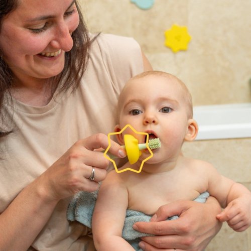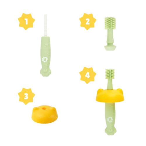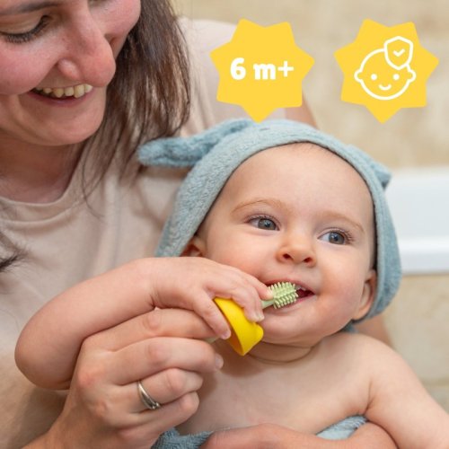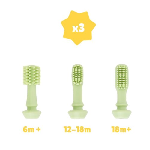 díky 3 různým nástavcům (6-12m / 12-18m / 18m+) jej lze přizpůsobit každé fázi prořezávání zoubků