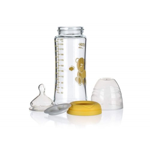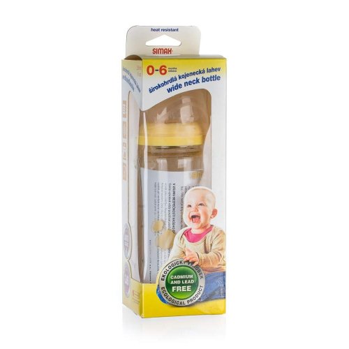 Láhev kojenecká širokohrdlá 0,25 l, se vyrábí z tvrdého boritokřemičitého skla, které je velmi odolné (mechanicky i teplotně +300 / -40 stupňů). Výhodou je dlouhá životnost, hygienická nezávadnost a snadná údržba (lze mýt v myčce na nádobí).