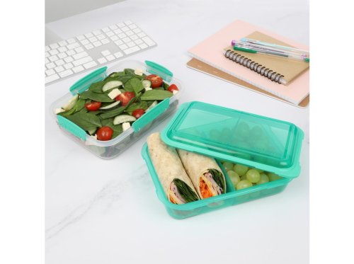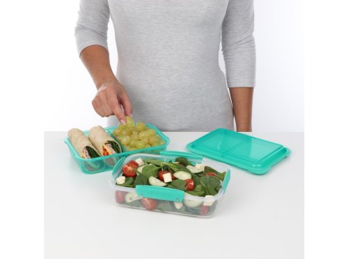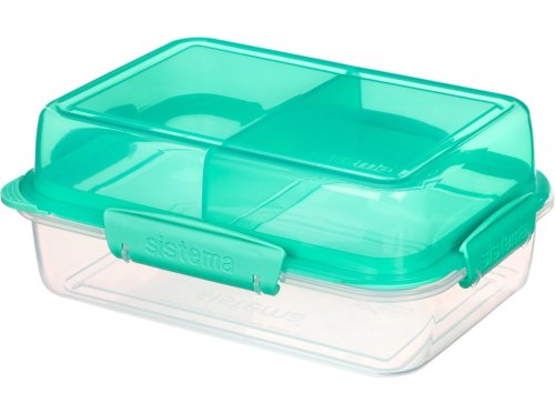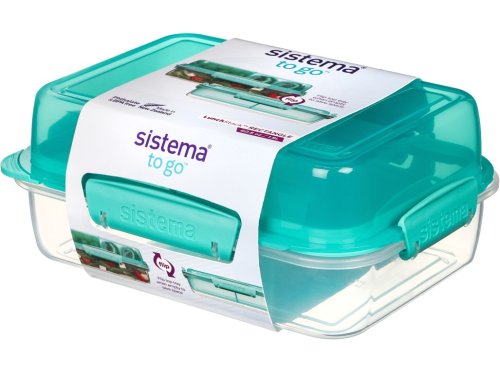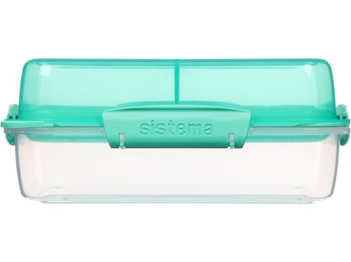 Krabička na svačinu s praktickým vnitřním uspořádáním. Krabička se skládá ze dvou částí (spodní a vrchní), z nichž jedna je rozdělena pevnou přepážkou na dvě poloviny. Spodní a vrchní část jsou oddělené vyjímatelnou přepážkou, kterou lze využít jako tácek nebo talířek. Vyjímatelná přepážka má po svém obvodu těsnění, které spolehlivě ochrání spodní i vrchní část krabičky. Vrchní (barevná) část se po zkonzumování obsahu dá vložit do spodní a zaklapnout zaklapávacími klipy Sistema. Lze tak ušetřit místo v batohu nebo tašce. Vhodné pro mytí v myčce nádobí v horním koši.