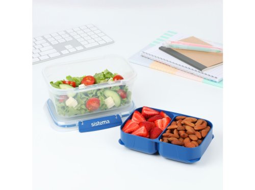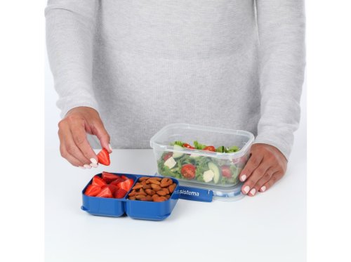 Sistema 1 l TO GO STAX je skvělou volbou pro všechny, kteří hledají praktický a stylový způsob, jak bezpečně přenášet jídlo do práce, školy i na cesty. Odnímatelný zásobník umožňuje oddělenní různých druhů potravin, takže si můžete vychutnat čerstvou a chutnou svačinu kdykoli a kdekoli. Stohovatelný tvar zajišťuje maximální využití prostoru ve spíži, chladničce a mrazničce. Snadno uzavíratelné klipy Sistema® a pružné těsnění udržují potraviny déle čerstvé.