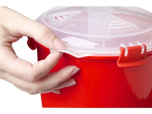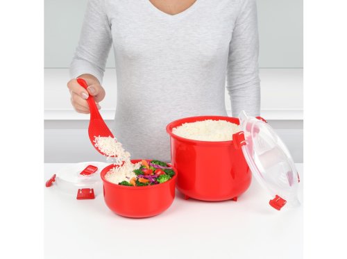 Stačí přidat rýži a vodu do základní nádoby, vložit talíř s tlakovou komorou, zavřít klipy a ohřát v mikrovlnné troubě. Unikátní talíř s tlakovou komorou zabrání přetečení a zajistí perfektní uvaření rýže. Více informací na tomto odkazu: https://www.sistema-krabicky.cz/priprava-ryze. Tento produkt není vodotěsný.